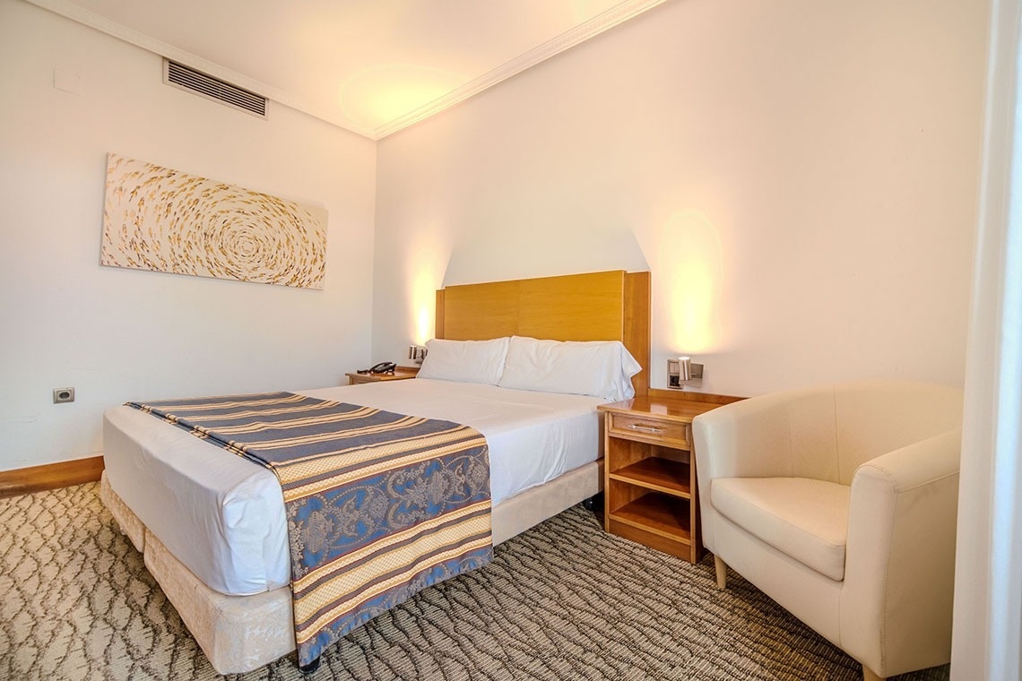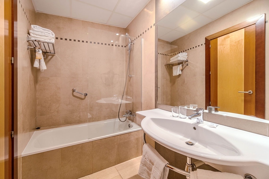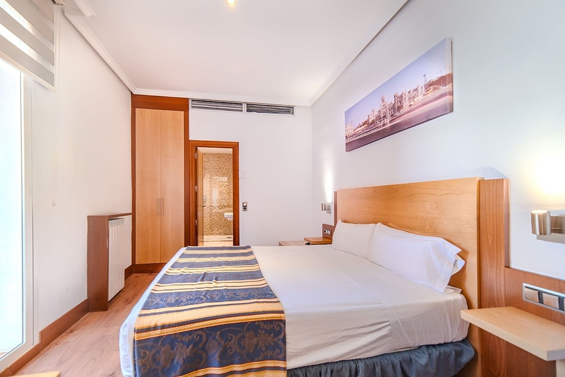 ( 2 Adultos )Habitación insonorizada de 14 m² con 2 camas individuales una doble. Calefacción, aire acondicionado, TV, WiFi gratis, caja fuerte, baño con bañera y con artículos de aseo básicos.