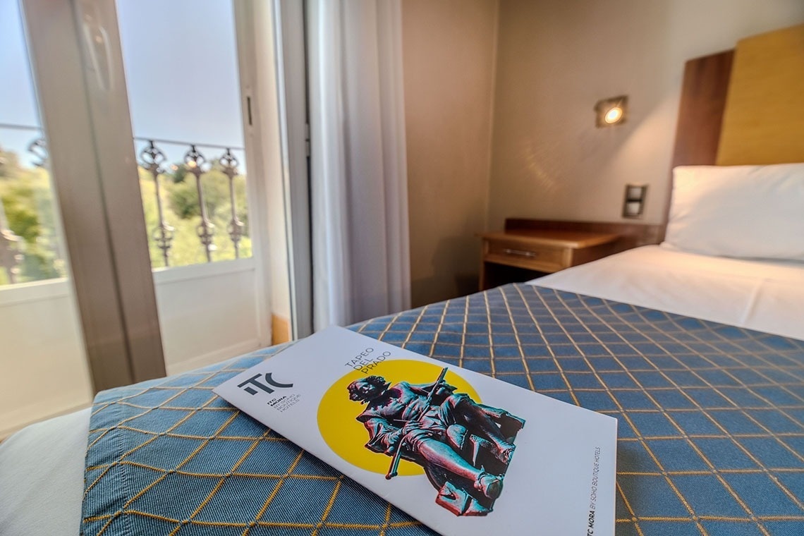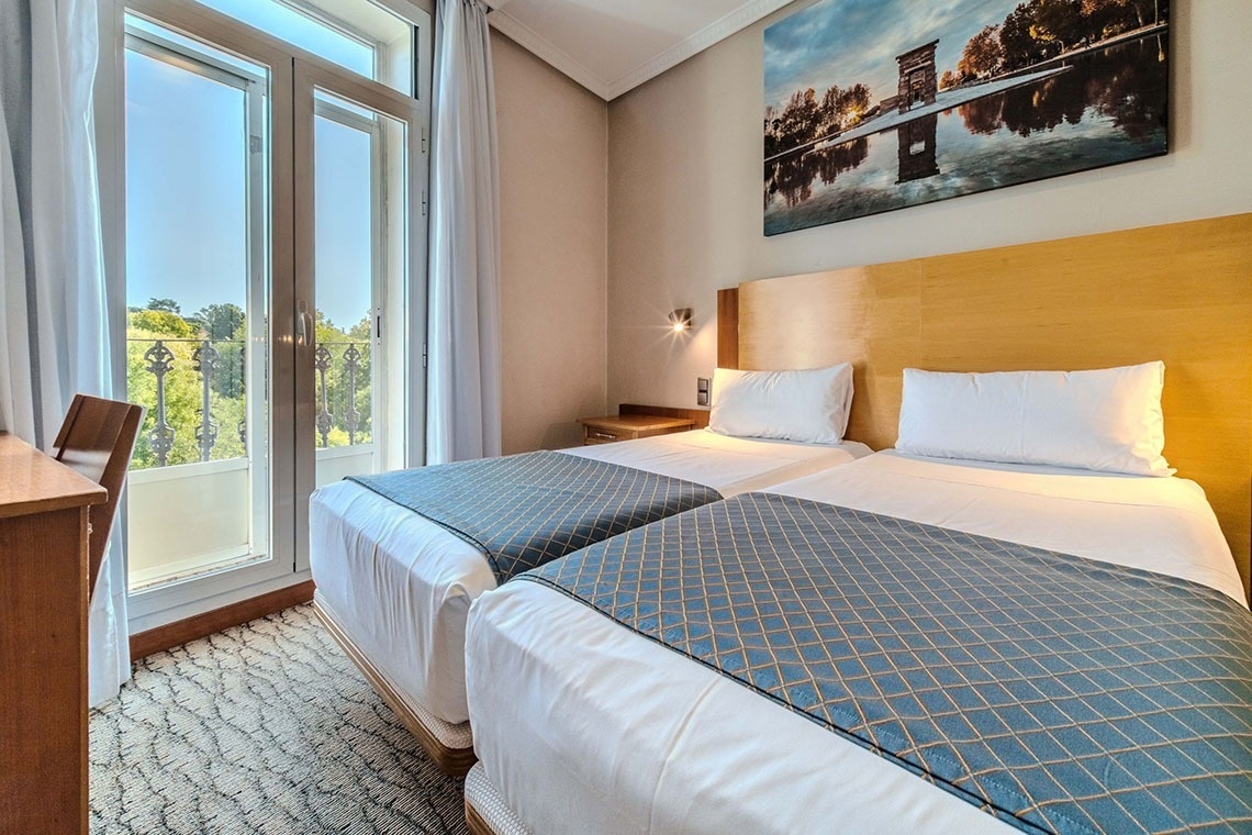 Habitación insonorizada de 13 m² con 2 camas individuales. Calefacción, aire acondicionado, TV, WiFi gratis, caja fuerte, baño con artículos de aseo básicos.